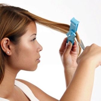 Hairdressing level, shaped like a clip, greatly simplifies the process. The choice of the type of level depends on the place of cutting the tips. If you need to trim the bangs, then it is better to get a small level, and if you want to trim the hair along the entire length, then you need to use a higher level.