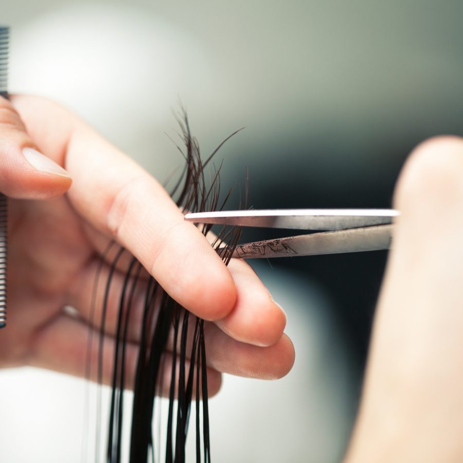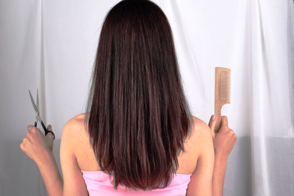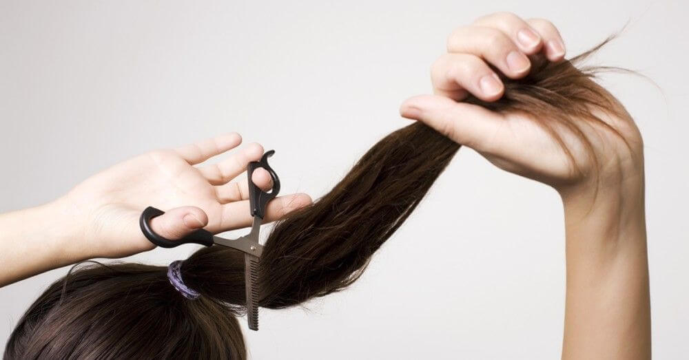 Align the cut first with one hand. Well combed hair, determine the shortest strand, it is for her and we will navigate. Fix the hair between the index and middle finger just above the intended cut, the shortest strand should be visible, gently cut off all the long hairs.