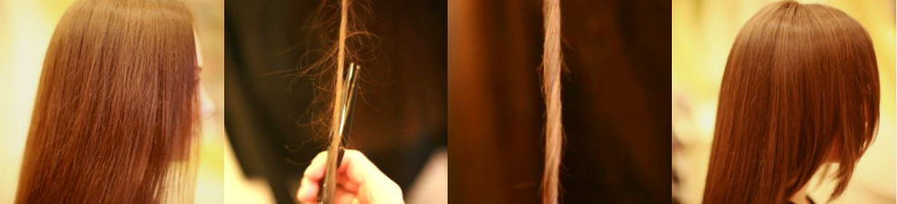 Divide hair into 2 parts and lower your head down. When trimming the tips, the head should be parallel to the floor surface.
