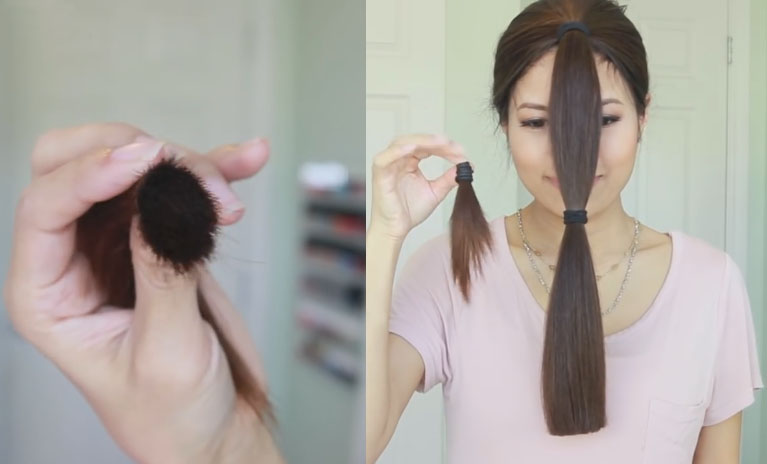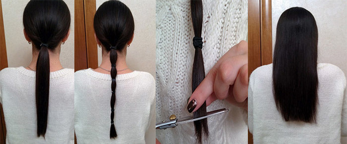 Fix the tail with rubber bands. As a rule, one elastic band is enough, fixed closer to the future cut line, but it can be fixed with two, one closer to the hairline, and the second closer to the cut line. We fix a thin strand between the fingers, and cut off the necessary length, while holding the scissors parallel to the ends of the strand.