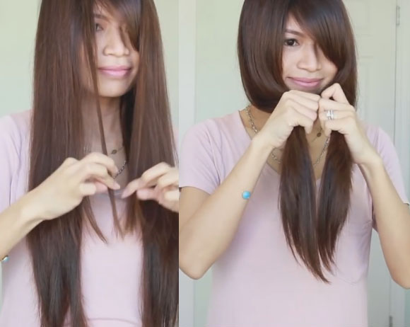 You can cut it to the desired length without clamps (rubber bands, clips). The easiest way is to twist the hair into 1 bundle. Lower your head and comb your hair, collect it in a ponytail and twist it into a tight rope. Fix with your hands and cut the desired length. Again, comb and twist the braid of the hair, but this time twist it in the opposite direction. Trim loose ends.