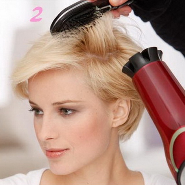 - Dry hair with a hair dryer using a round brush in order to achieve volume in the root part of the hair.