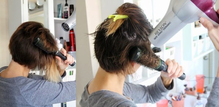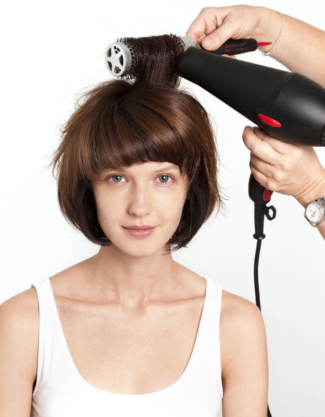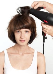 Clean hair treated with styling mousse must be mentally divided into several segments: bangs, side strands and the back of the head. To create the volume, it is necessary to slightly raise the side strands with a hairdryer or a round comb, and then dry it with a hairdryer. Then you need to align the bangs with a comb, without straightening, and dry with a hairdryer.