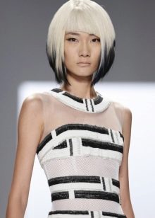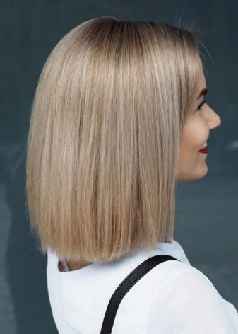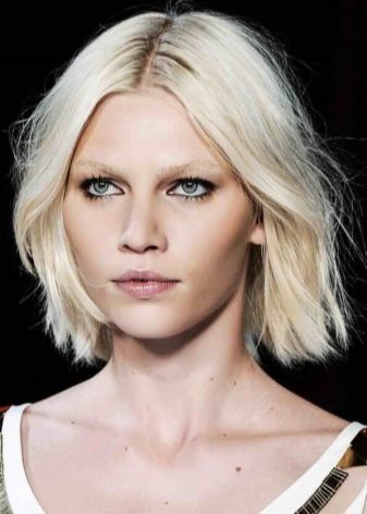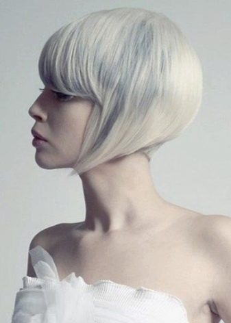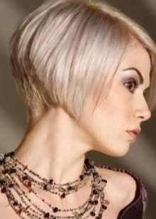 The hair on the back of my head is cut short enough for one more type of caret - on the leg. At the same time, an impressive volume is obtained on the back of the head. The front strands remain straight and long (about 5 cm below the chin). This haircut looks great on girls and women with a beautiful neck and straight hair structure. Also, this hairstyle is perfectly combined not only with a platinum blonde, but also with highlighting.
