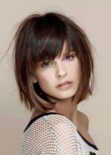One of the options for medium hair is bob car. Haircut with elongated bangs and strands of the face is perfect for brave girls. A sloppy or elegant bean will accentuate your eyes and cheekbones, making your face visually thinner. The disadvantages of this hairstyle include the requirements of careful styling and cutting. Without an experienced hand of the master is not enough. The leg can be framed straight or beveled, be small, almost invisible or high, maybe with bangs or without. Particularly impressive is the square bob with straight thick bangs. Attention is focused on the cut eyes, high cheekbones, facial contours.