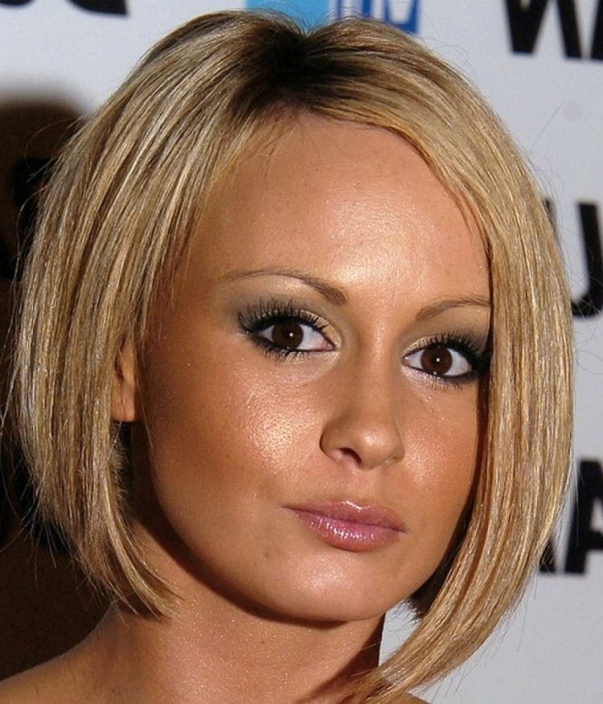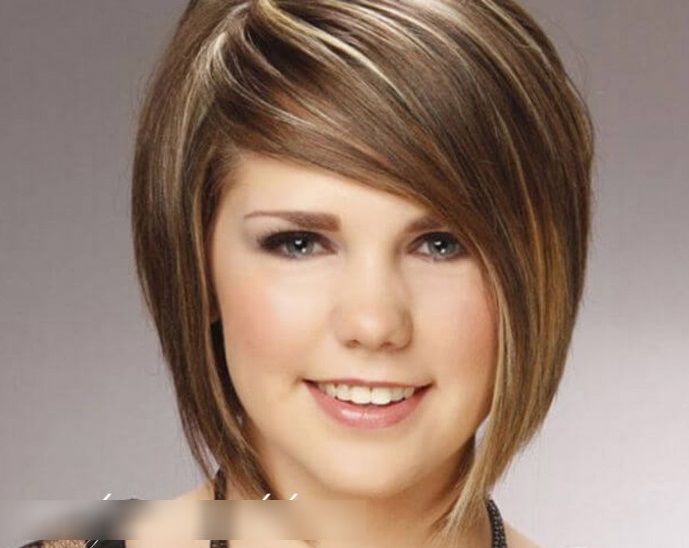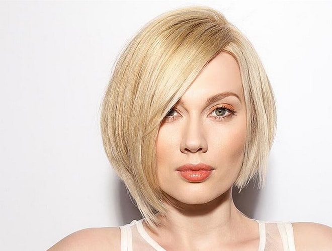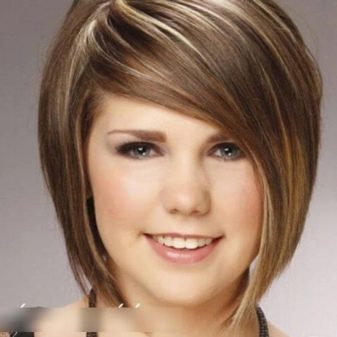 - Round. Cheeks wide, face rounded. Haircut from the back should be done with an open nape, and in front - below the cheekbone line to narrow the face. A short square with elongated front strands without a bang is what suits chubby girls. The elongated strands visually stretch the face and hide its fullness.