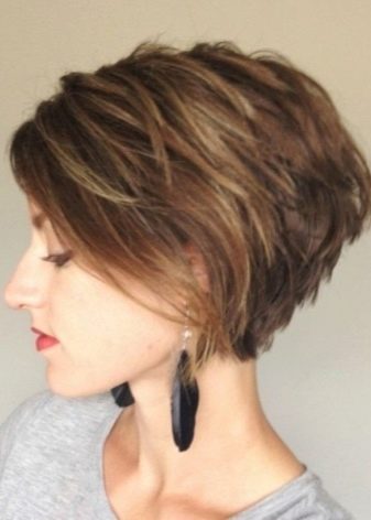 - Short caret with lengthening. There are long curls around the face, but the back is all cut short. The nape and neck are open. Hair does not require special care, and long curls in front visually lengthen the face.