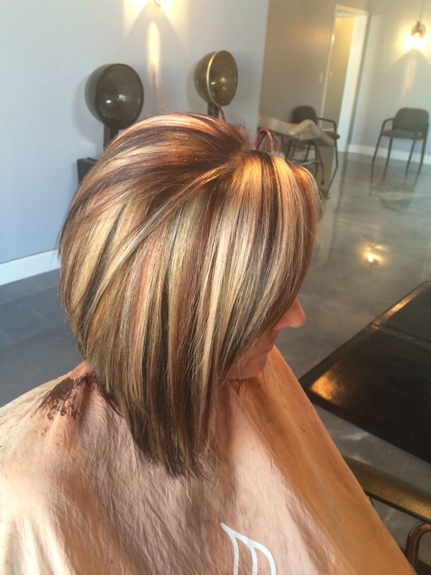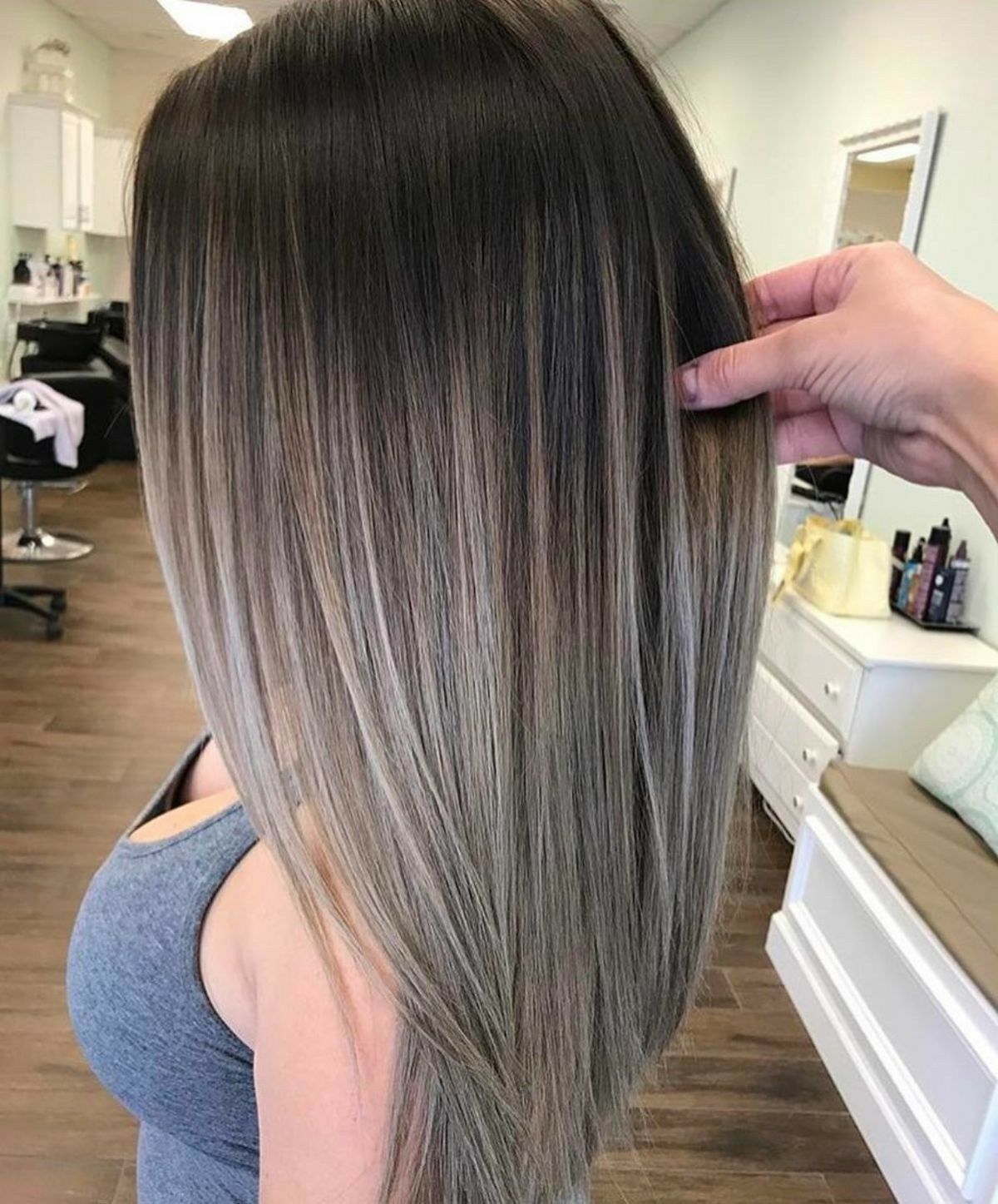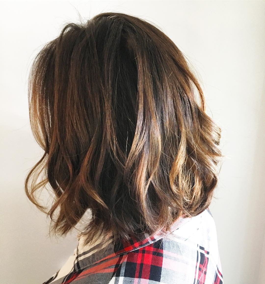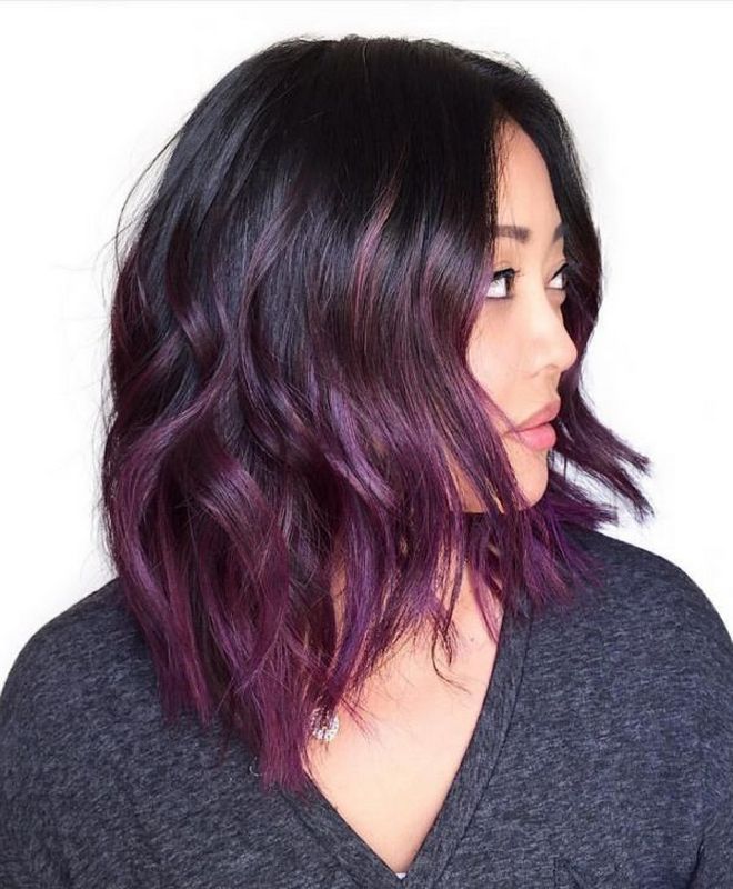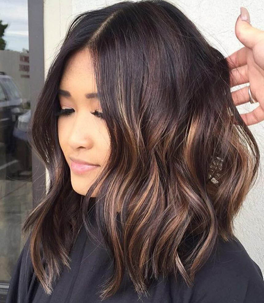 This is a fairly versatile dyeing technique that is optimal for dark and light brown hair. Most often her use on cascading haircut. During the work, the master chooses an indirect parting and grabs strands along it. Here they use bright and colorful color combinations.