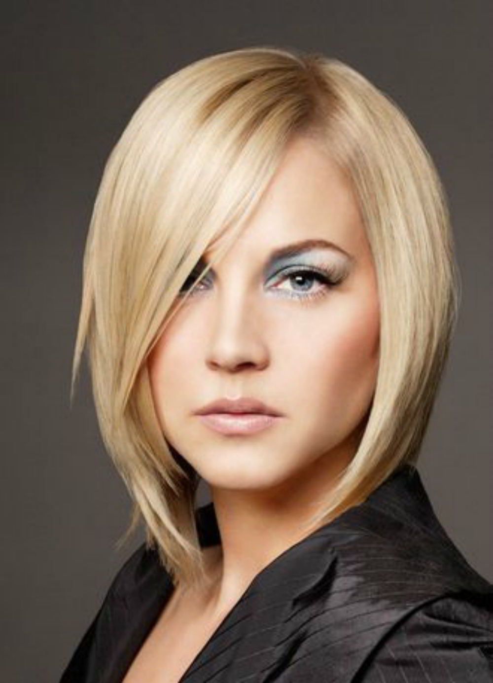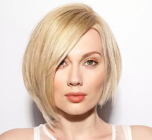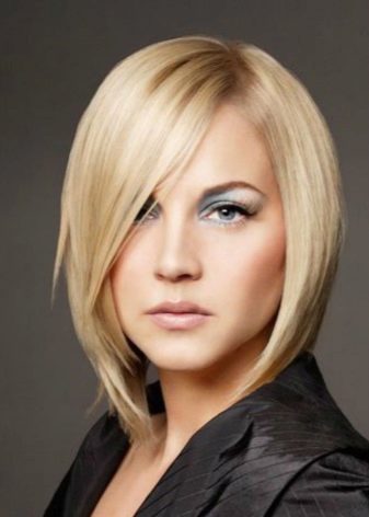 Kare with oblique bangs on the leg is suitable for women with pear-shaped face. It is also called oblique square, because often the whole form lies precisely in the bang itself. Oblique bangs (graded or straight) can change any familiar image beyond recognition, bringing a creative touch to it.