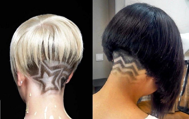 An unusual solution to the design of this haircut are options with shaved curly back of the head or temporal part, and sometimes both at the same time. A shaven pattern or ornament in combination with long graduated strands looks unusual. Such a contrast can impress and refresh a stylish image with the courage of performance.