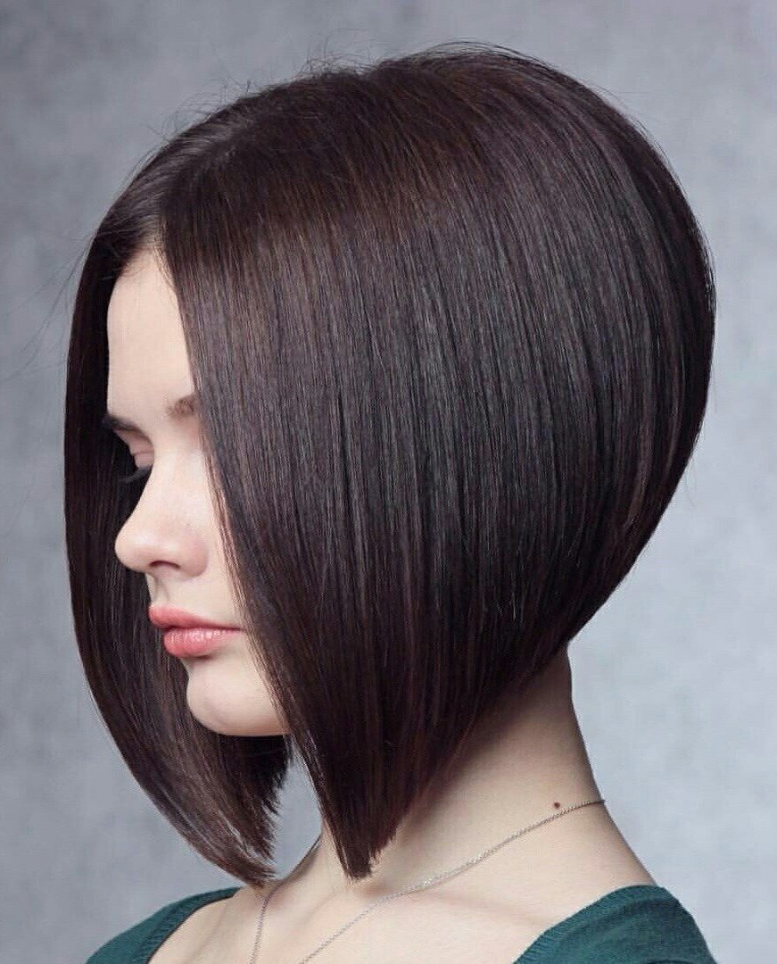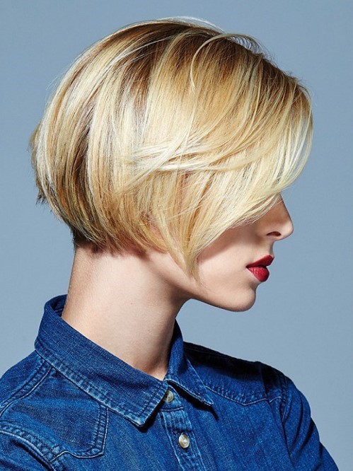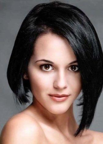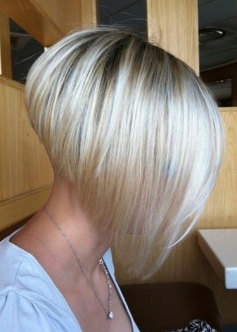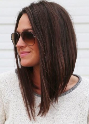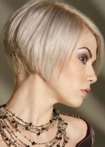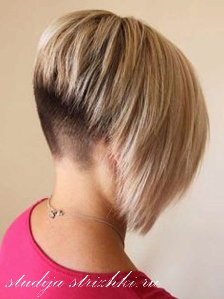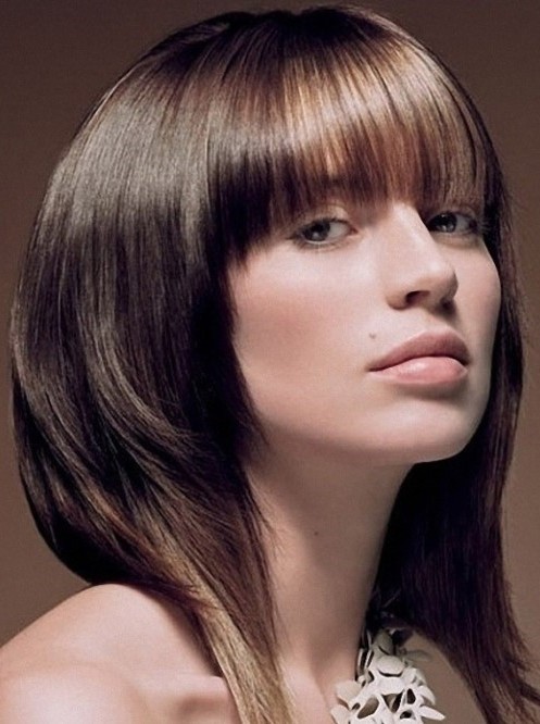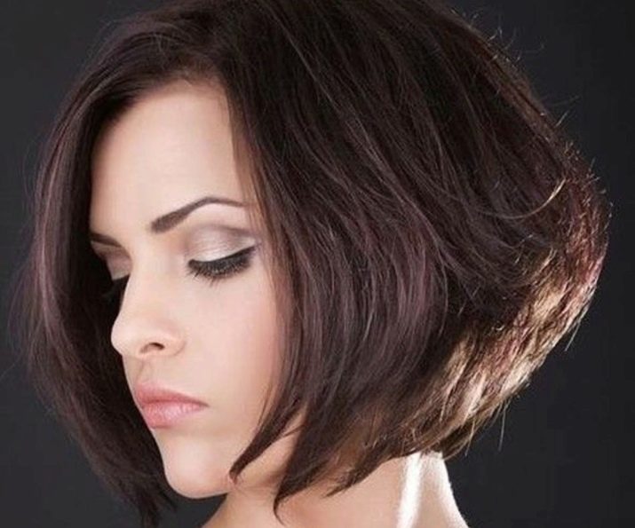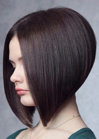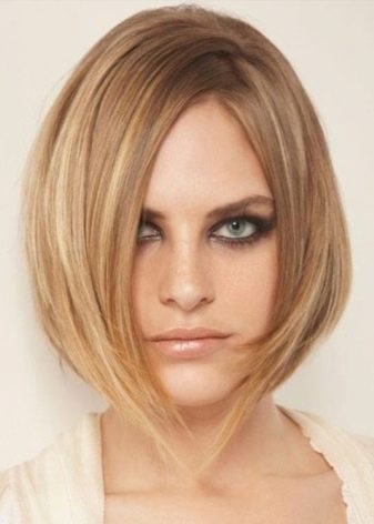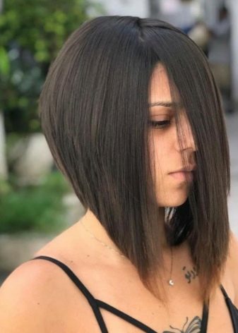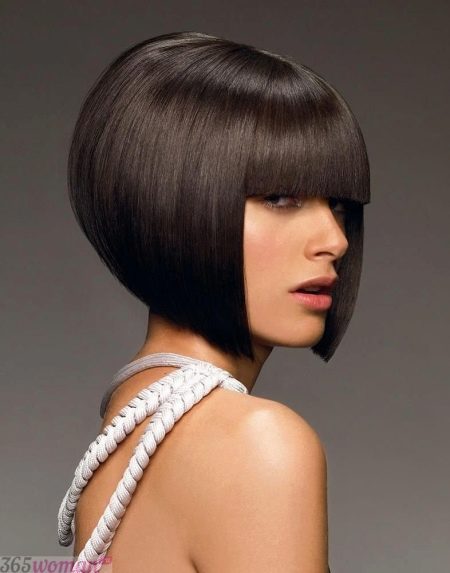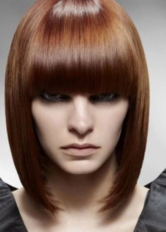 The angle in the haircut is smooth or extremely sharp, everything will depend on the wishes and tastes of the girl. The strands on the occipital region in this case are cut fairly short. The hair in front can reach the collarbone. This haircut with bangs emphasizes the entire structure of the hair and visually corrects the flaws on the face.