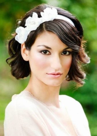 Another option with flowers on the rim. It is necessary to make volumetric curls, otherwise thin will look disharmonious.