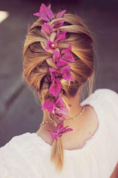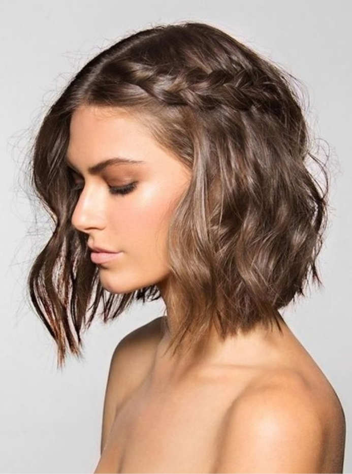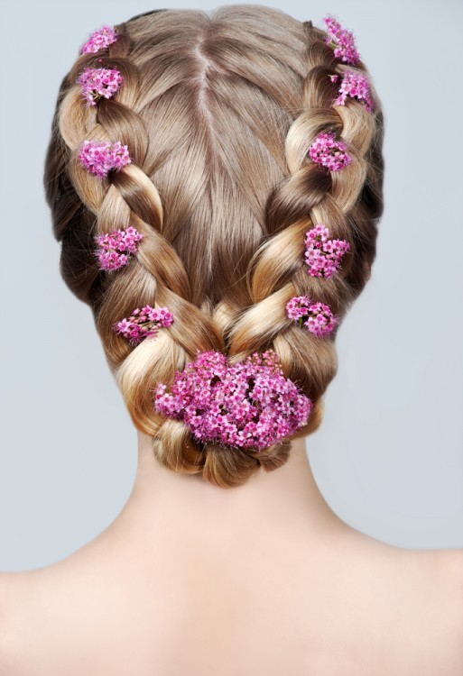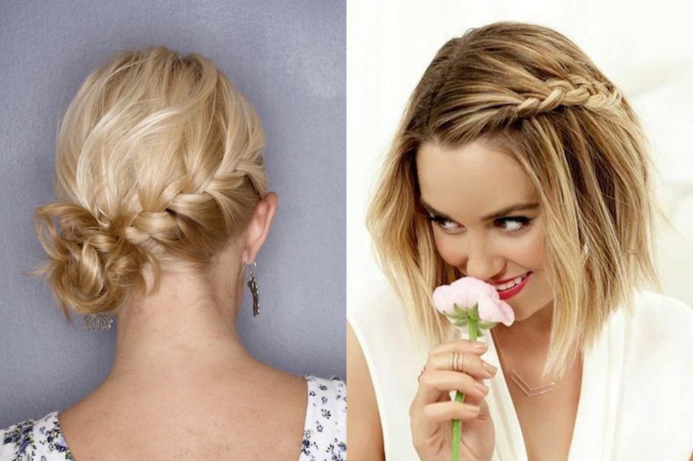 The combination of two French braids on both sides of the head, fastened to the back of the head with a beautiful hairpin looks exquisitely. And you can also make one asymmetrical pigtail on the side for shoulder-length hair, it can be complemented with large curls.
