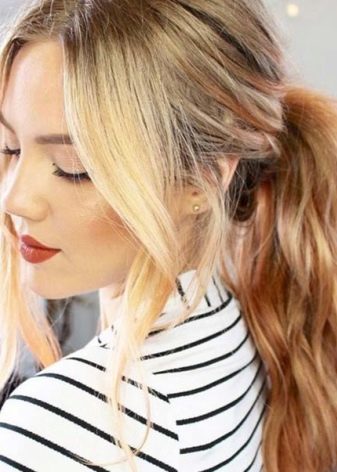 For cascading haircuts with bangs suitable hairstyle with a tail. In order to make the image more romantic, before you collect the hairs, they should be twisted a little, making large curls. Oblique bangs complements the bow and makes the hair finished. In order to make the hairstyle more "relaxed", on each side of the face of the tail should be released on a small section of hair.