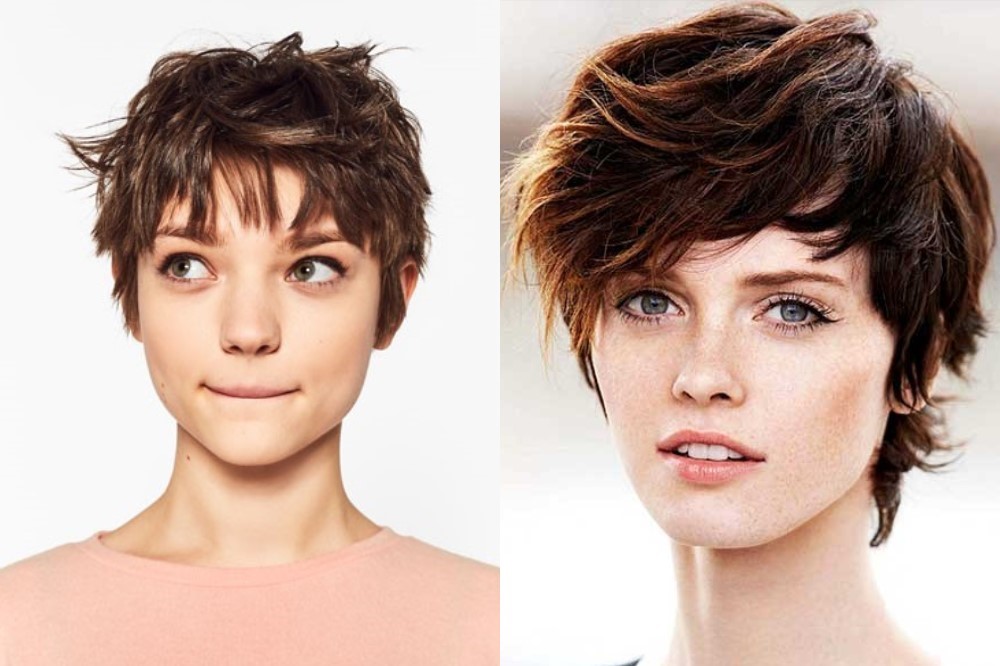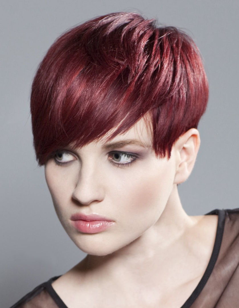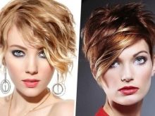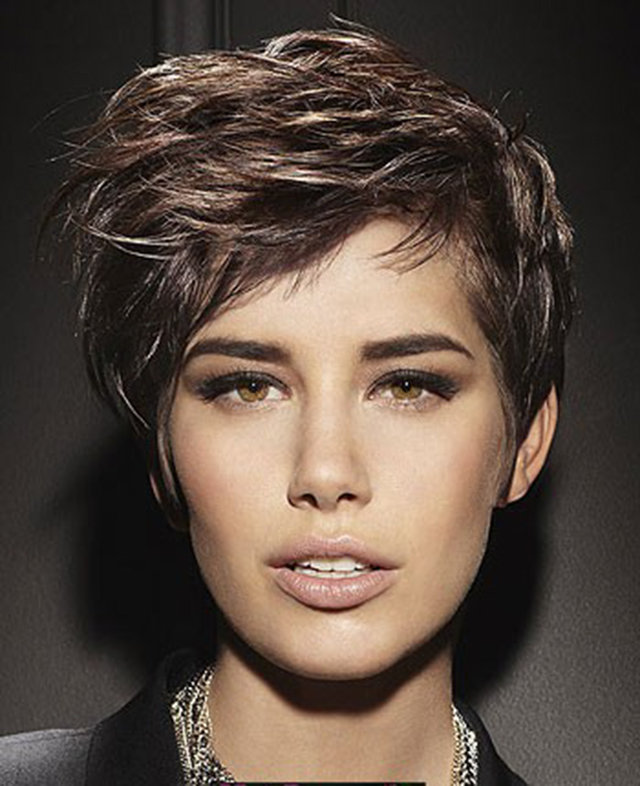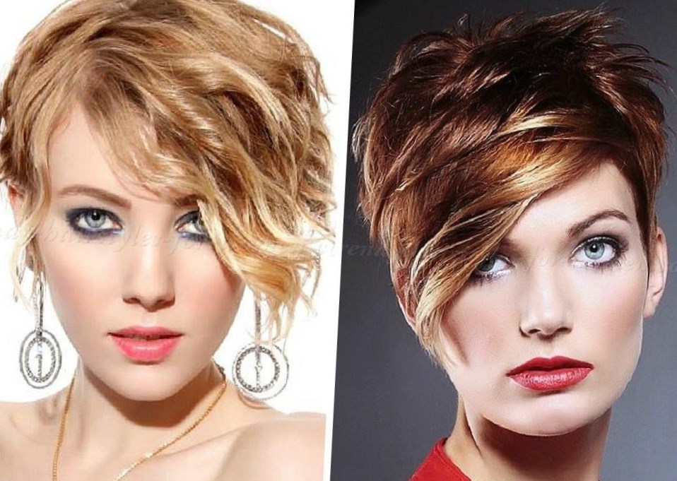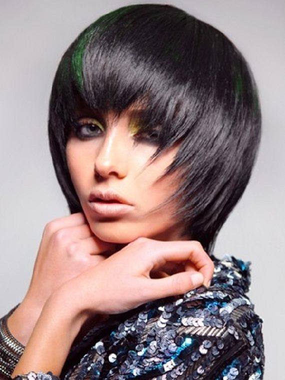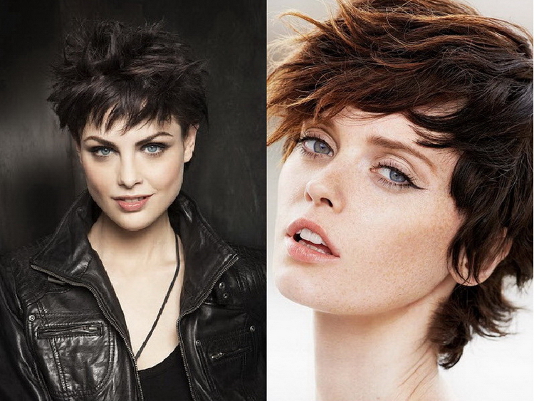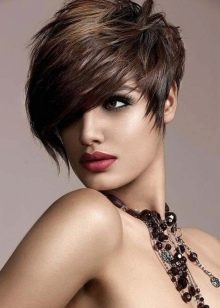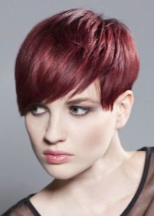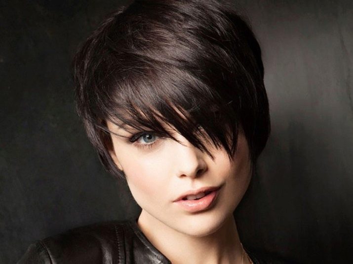 Oblique bangs in a pair with short hair looks good on any face shape. Many girls choose pixies with oblique bangs and attract the views of others. Add effect is capable of bright staining. Popular shades such as cold blond, bright red, bitter chocolate.