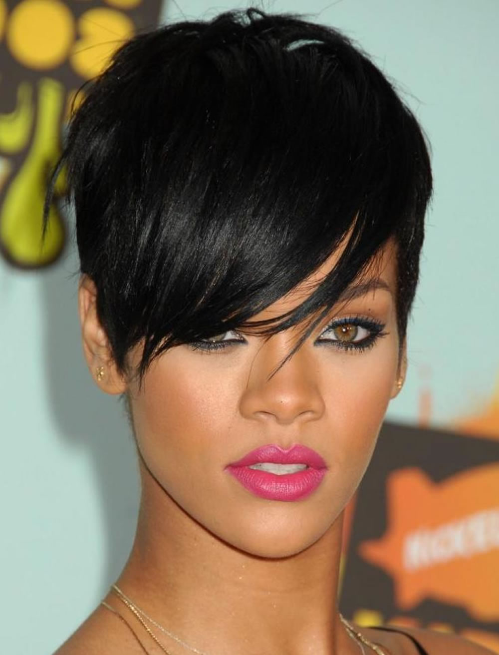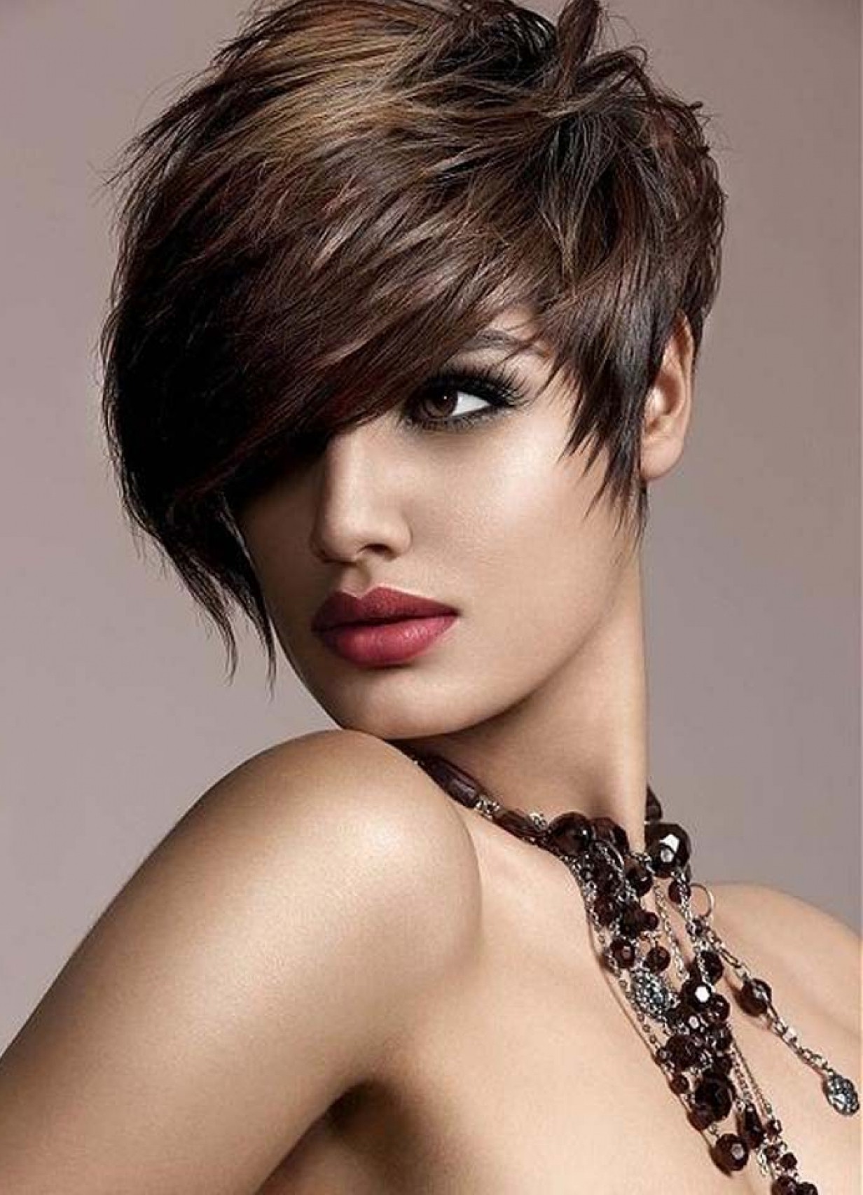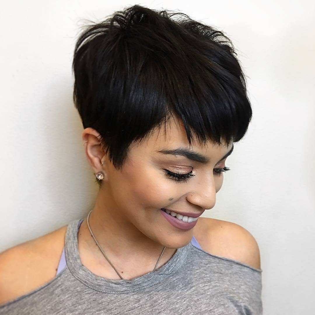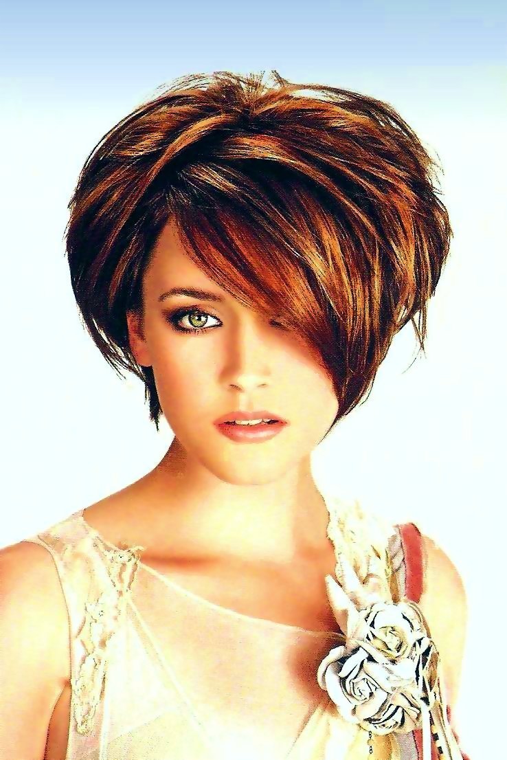 Oblique bangs in a pair with short hair looks good on any face shape. Many girls choose pixies with oblique bangs and attract the views of others. Add effect is capable of bright staining. Popular shades such as cold blond, bright red, bitter chocolate.
