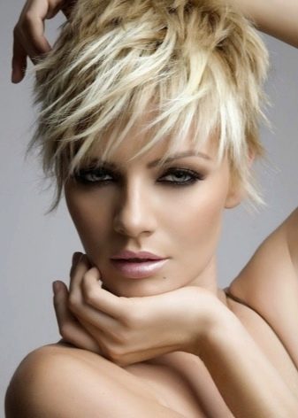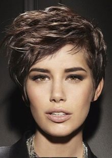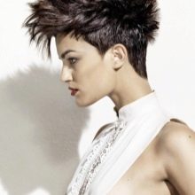 Chaos boldly and stylishly looks even on a very short haircut with bangs. To create a mess you should use gel or wax. "Encouraging" the fingers of the hair, you can get the desired result. This installation is relevant for clipping pixie, garcon.