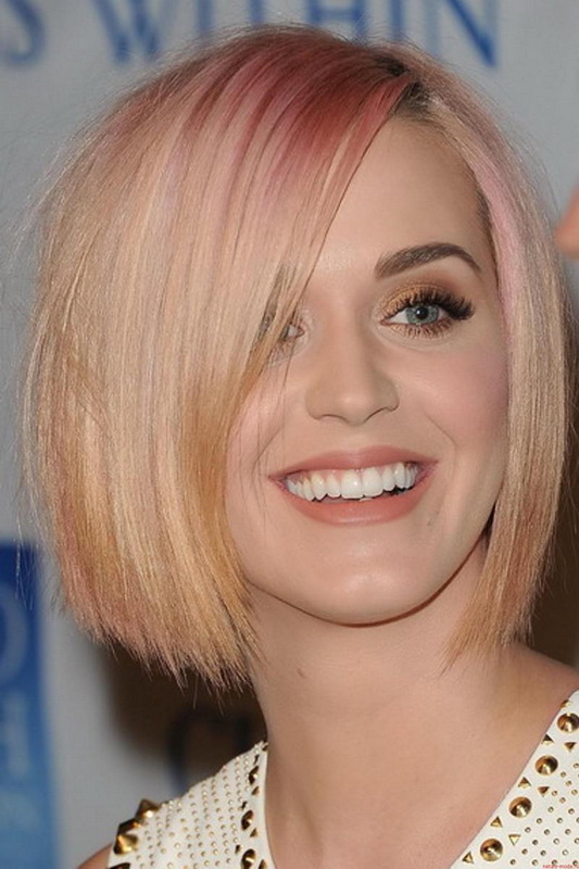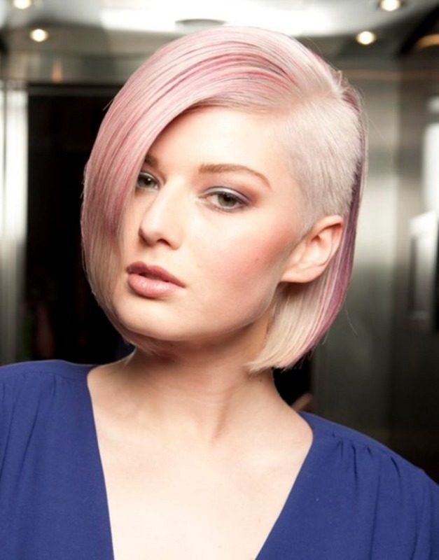 - Asymmetry. One of the novelties of recent years, not losing relevance. And its most interesting variation is a shaven temple. Most often it is combined with unusual staining, shaved drawings, hieroglyphs. Lovers of “acidic” shades can experiment with bright colors: pink, blue, green. Looks very cool platinum blond in combination with "feathers" and shaved temple, painted in one of these tones. Brunettes also suit thick cherry, purple, malachite and bronze colors. Ladies with red hair can "play" all shades of golden-bronze scale.