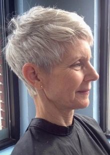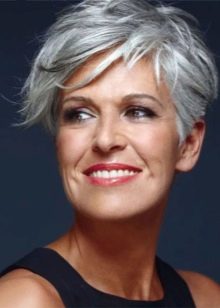 - Short haircut "Garcon" in combination with light silver in the hair and accented “torn” bangs helps to make the look more open, visually rejuvenates the face. Especially effectively, these hairstyles look in combination with a moderate evening make-up, large earrings.