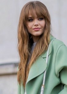 However, in haircuts on long curls, you can leave a long bang specifically to make the total weight of the hair look more voluminous. This part of it can be wound to the side with a curling iron, as well as combed back.