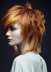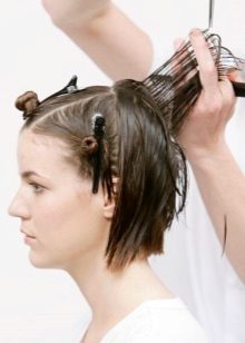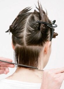 Divide hair into 5 parts: 2 temporal zones, parietal, lower and upper occipital. Each must be braided and stabbed. Starting from the lower occipital zone, separate the strand by strand. Lightly pull it off at an angle and cut to the desired length. Take the following and also pull it off and cut it.