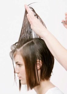 Then, freeing strand by strand, we begin to form a haircut. We take only those strands that belong to the back of the head. In order to achieve elongation closer to the face, the strands must be delayed at an angle of 15 degrees relative to the head. Scissors are also kept at a slight incline. Due to this, each subsequent strand will be longer than the previous one, while there will not be a sharp difference in height.