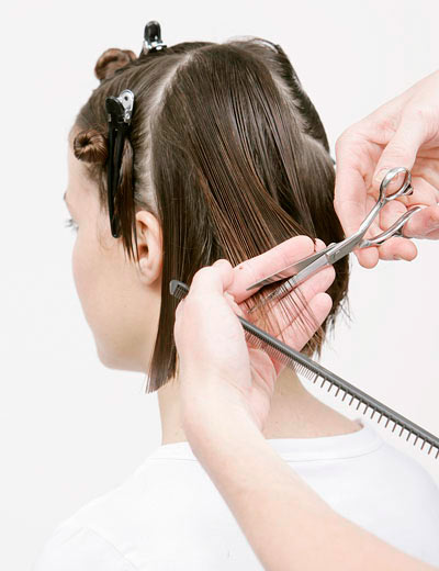 If necessary, reduce the length of the bulk of the hair, it should begin with it. To do this, separate the hair straight parting. Starting from the back of the head, separate the strand after the strand and trim to the desired length. It will be necessary to do this first from one side, then from the other side. Reaching the ear line, stop.