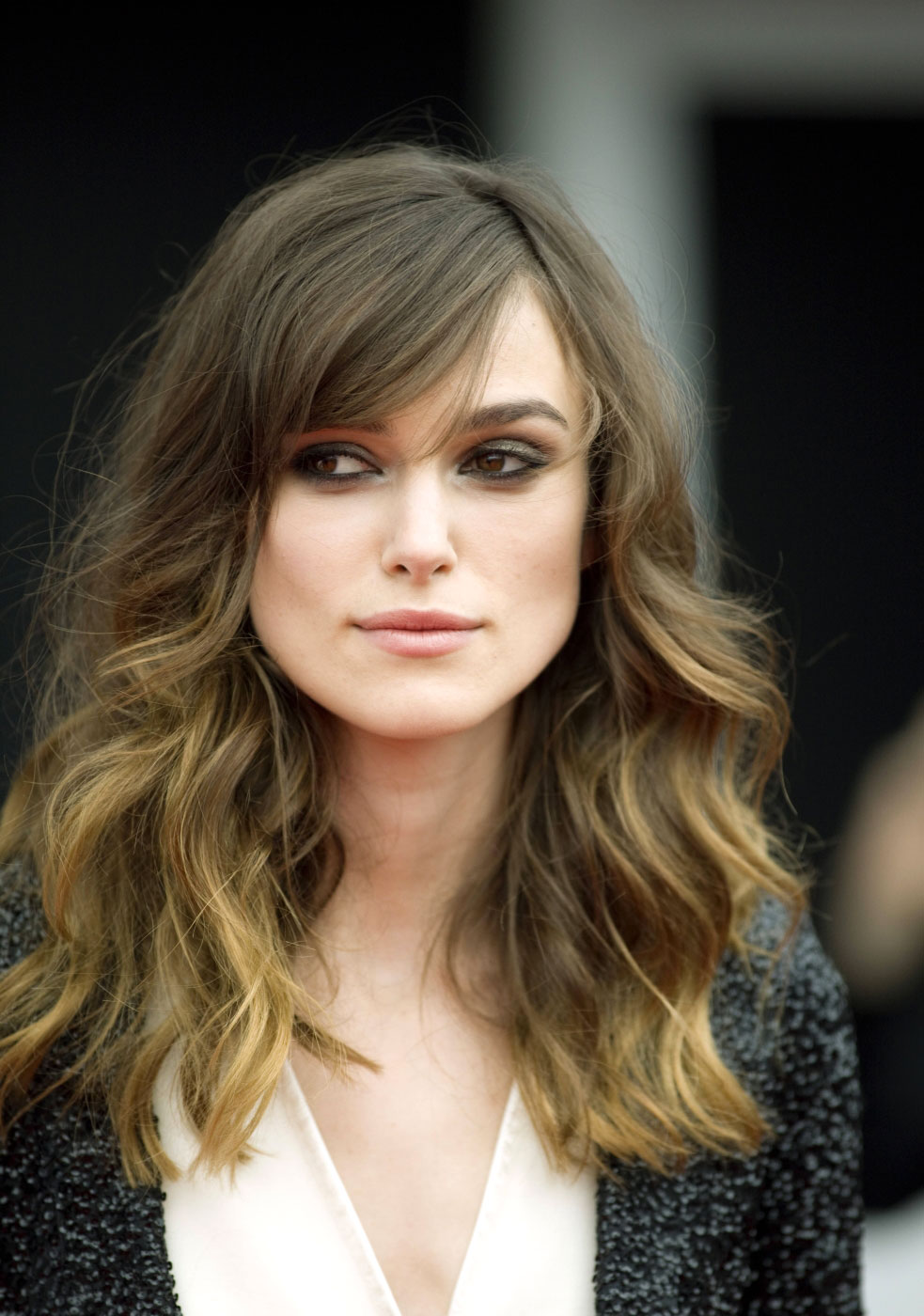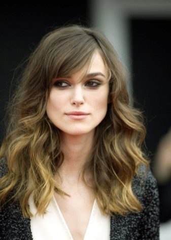 Owners of a sharp line of cheekbones and a rather heavy chin will suit a not very thick kind of oblique bangs, which at the same time is made with a smooth transition from a short section to a long one.
