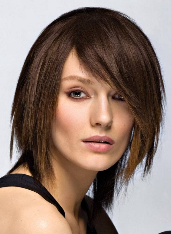 That is why here you should avoid direct parting and the same straight bangs. It is advisable to hide a little forehead behind oblique bangs and further profile it. Visually, the face can already be made asymmetrical haircut.