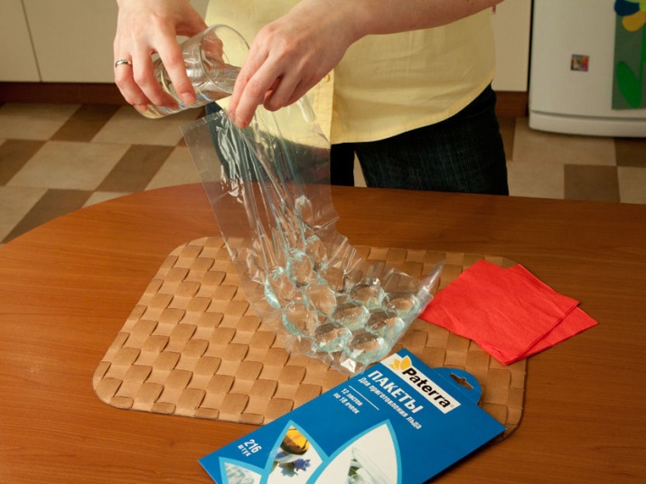 To get it, pour ice into ice molds and put them in the freezer. As soon as the water hardens, it will be possible to start making ice bags.