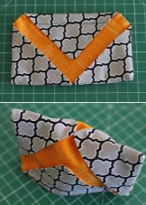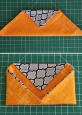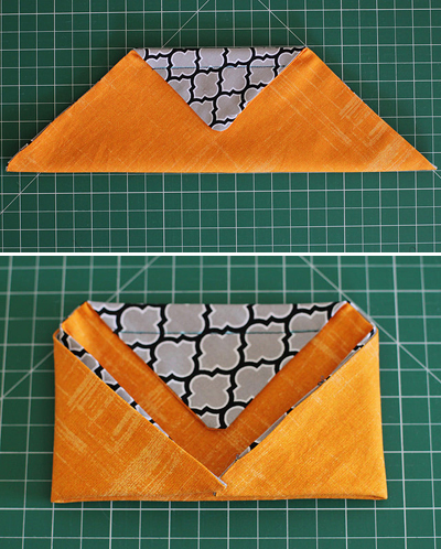 To carry out such a handbag does not require a lot of material and complex patterns - it is made from two pieces of fabric, stitched together, which are then folded, as shown in the photo, and stitched.