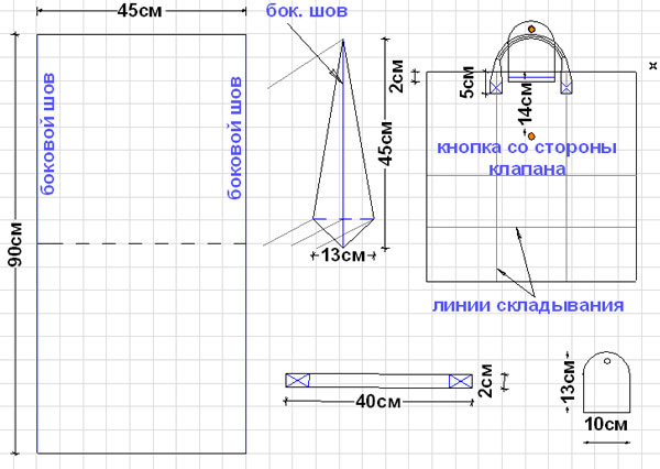 Square and rectangular bags - this is one of the most common options. This bag can be of any size and is perfect for everyday use. It consists of a base, front and back, two sides, handles, zipper and, if desired, jewelry.
