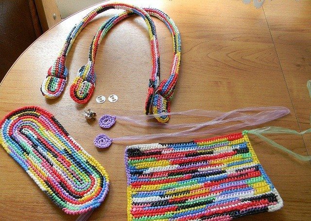 An even more unusual option is the use of garbage bags. Yes, the most common garbage bags, or any other plastic bags. Stripes are cut from them, which are then turned into crochet material.