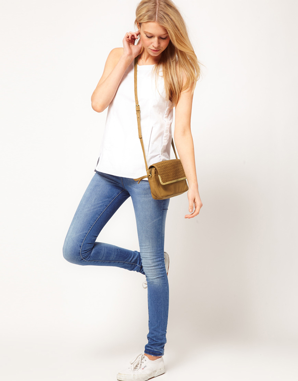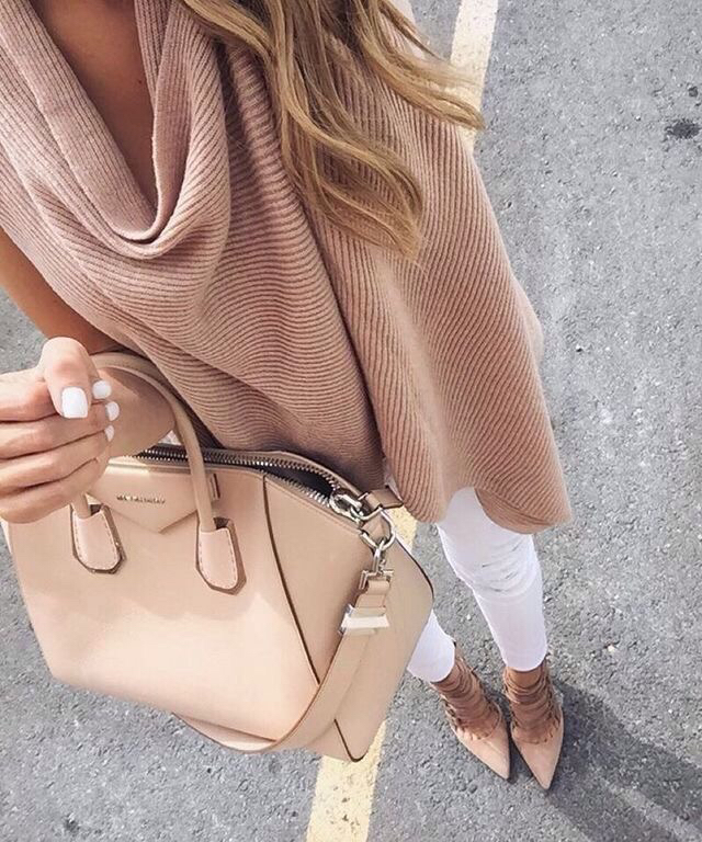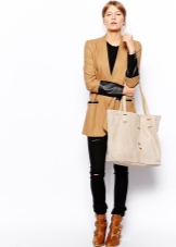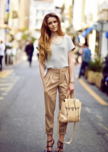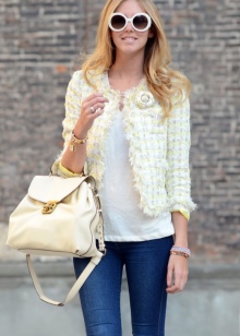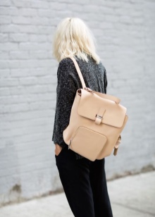 - Urban or more casual images are best complemented by a soft beige bag with short handles or backpacks. High-waisted loose jeans and a light-colored top, combined with a leather backpack and color sneakers are a great choice for a girl.