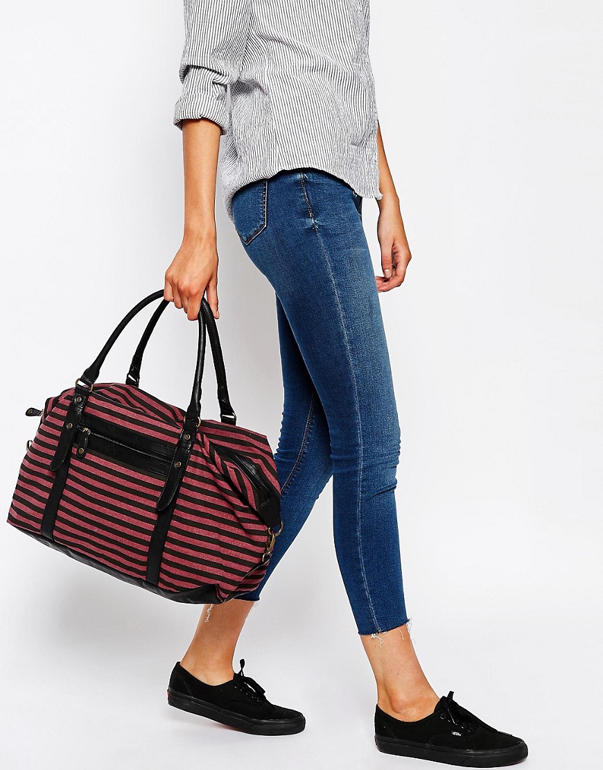 Modern travel bags look very beautiful and feminine. They are decorated with various prints, bright colors and inserts. As a rule, they are equipped with short handles of durable materials.