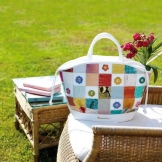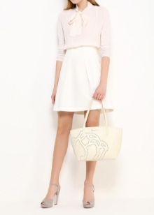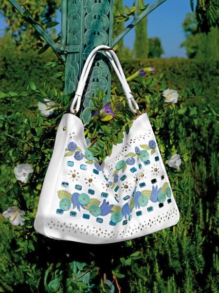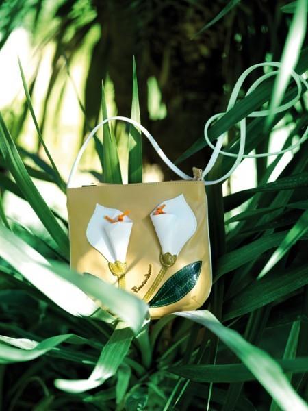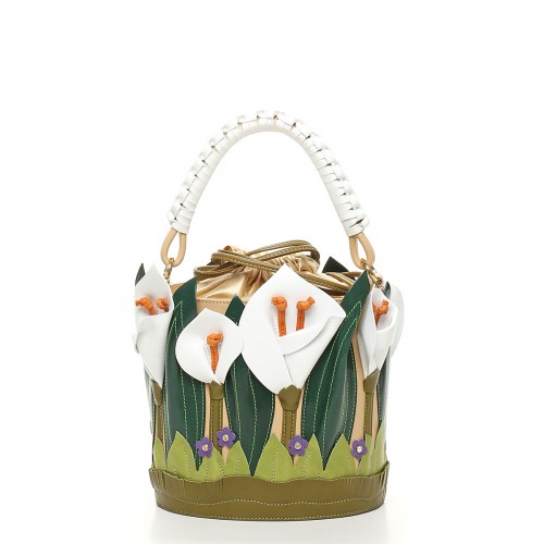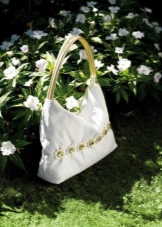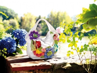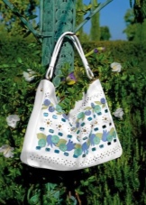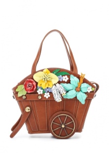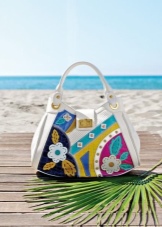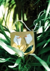 Very well the theme of applications is revealed in the models of bags of traditional forms. An example of this is the bag of Margaret's bag, made in the shape of a basket, around the perimeter of which are magnificent callas, with stamens made of leather perfectly visible inside the flower. The petals are made of white skin, the stems and leaves are made of the same green material. On the bottom of the bag are small purple flowers with rhinestones. The elegant wicker handle is decorated with white leather and attached with metal fasteners for gold.