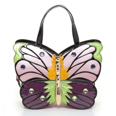 Butterfly-shaped satchel bag. The wings are made of pink, purple and gold patches of patent leather with a clearly defined embossed black patent leather. On wings beautiful stones of the rounded form settle down. The little body of the butterfly itself is made of metal construction under gold. Handles bags made of black patent leather.Luxury model for an evening out.