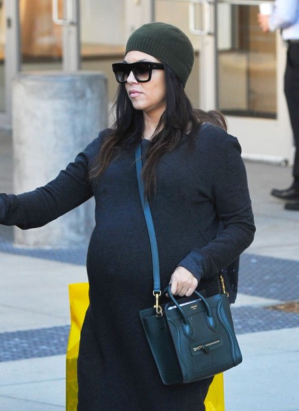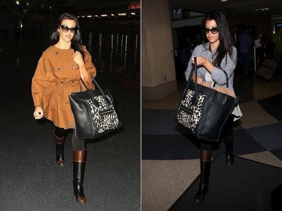 Outrageous fashion woman Kourtney Kardashian has created a bright and unusual image: a baggy brown coat with large buttons, black tight leggings, high leather boots, a massive square bag with a leopard print and black calm leather inserts on the sides.