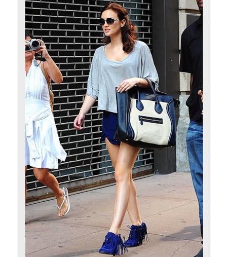 Always looking stylish and flawless actress Leighton Mister, was seen in an unusual image: she wore a bright dark blue skirt with a free gray top, complemented it with leather sandals in a skirt color, and carried in her bent arm a large Celine bag, made in two colors - deep dark blue shade and contrasting pale beige.