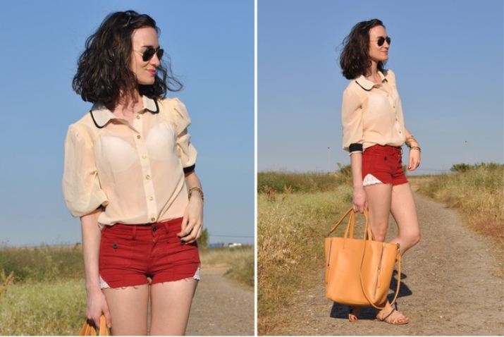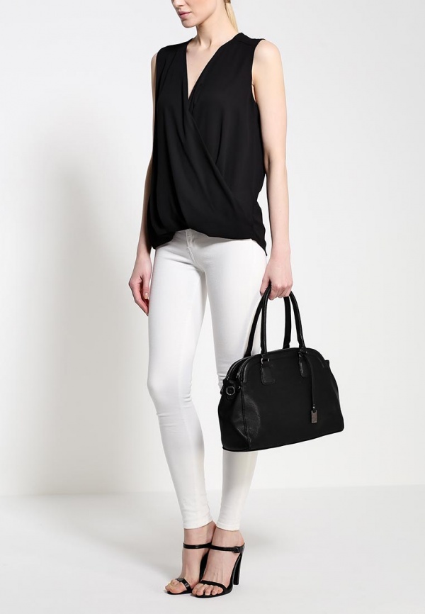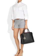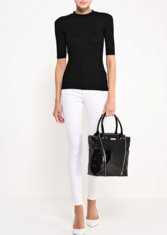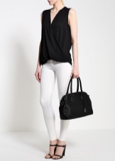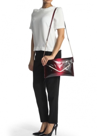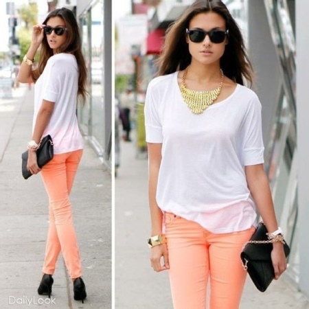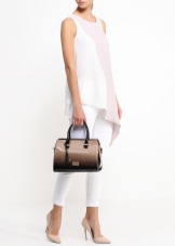 Do not forget about all your favorite classics. A small black clutch bag on a thin metal chain looks elegant and rich. It can be safely worn for a gala evening or for every day. White shirt with short sleeves and peach pants are beautifully combined with a black handbag, if you pick up black shoes with high heels.