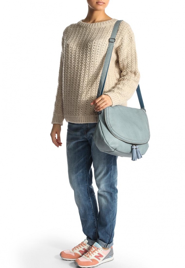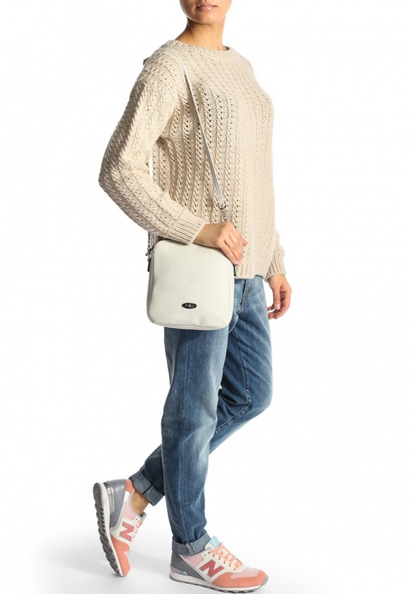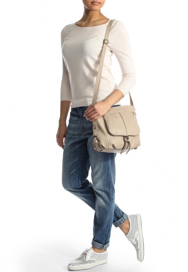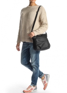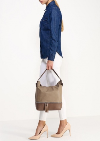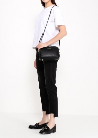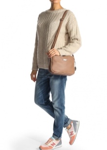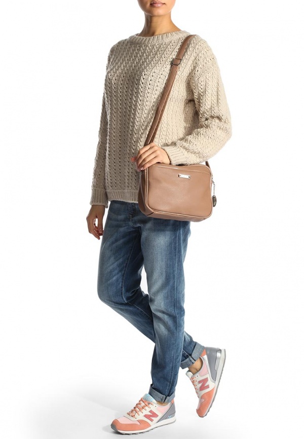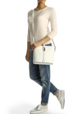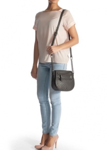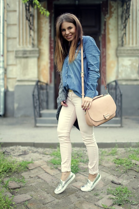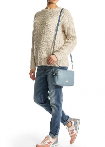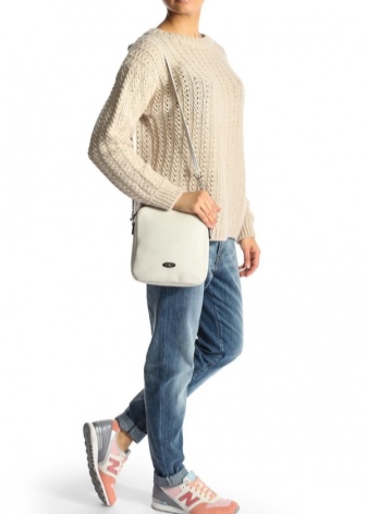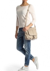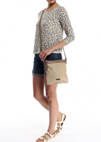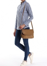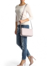 If you prefer an active lifestyle, then you should look at the compact models on a long strap. Convenient and comfort in the first place, although the stylish design attracts the attention of many girls. The cream colored model looks beautiful in an ensemble with beige jeans, a blue denim shirt and comfortable golden loafers.