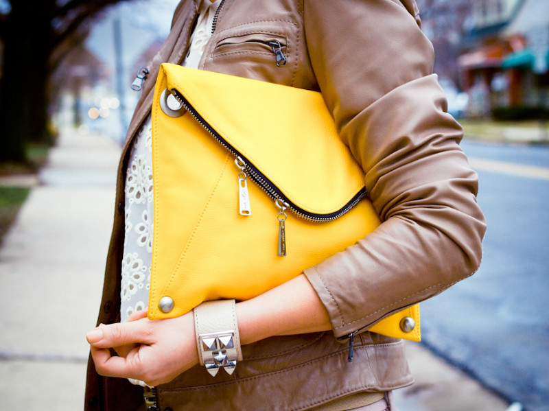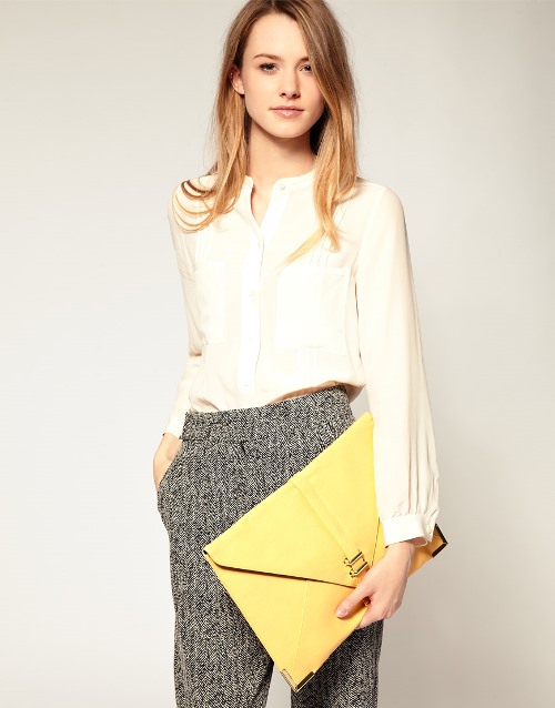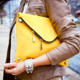 A stylish, elegant bag-folder, made in a pale lemon color, will successfully complement and decorate any strict outfit, for example, a set of strict trousers and a classic blouse.
