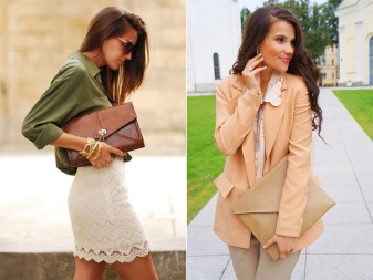 The graceful clutch of a deep brown shade perfectly shades the shirt of a khaki-colored shirt and an ivory lace skirt. Superbly assembled image, appropriate for the office and for the solemn event.