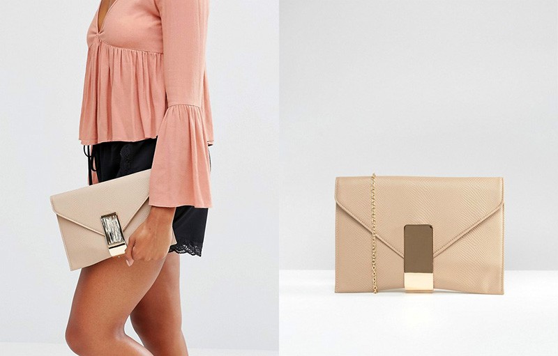 The sand-colored envelope bag is in perfect harmony with a strict and at the same time elegant image, sustained in warm, delicate tones.