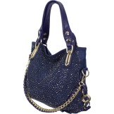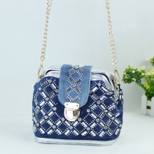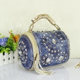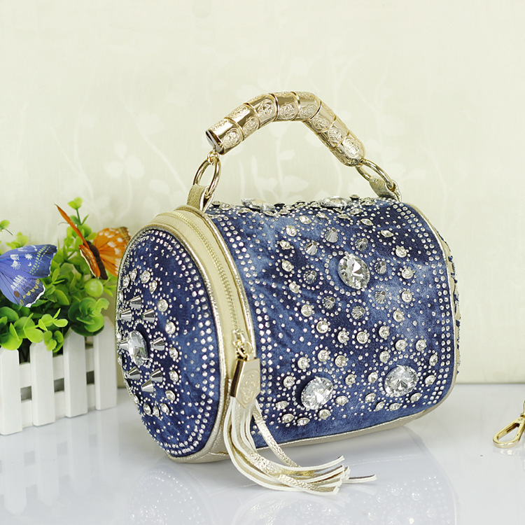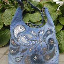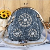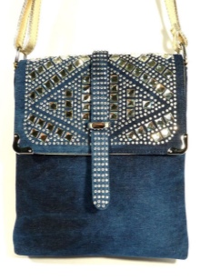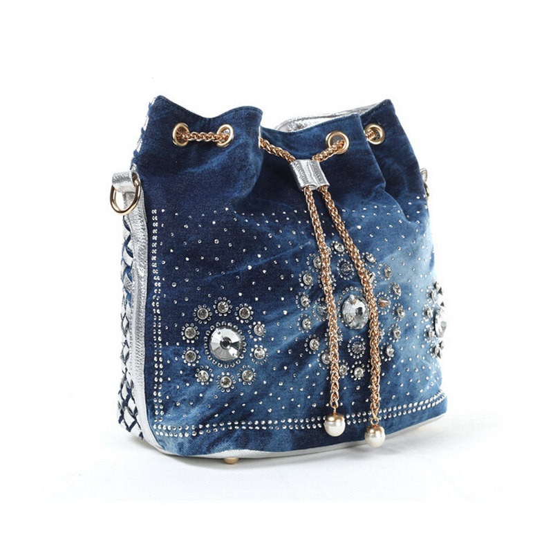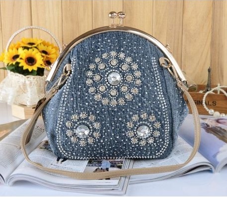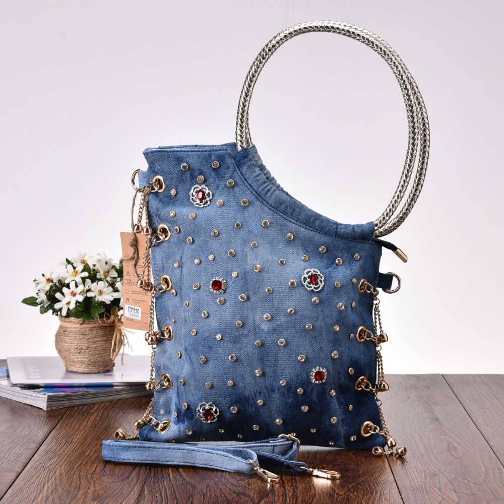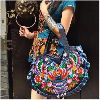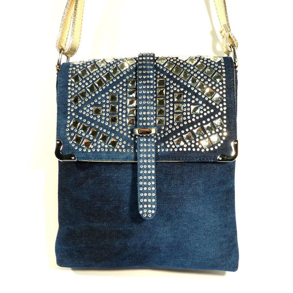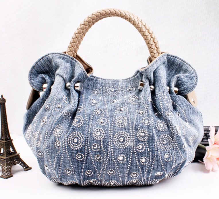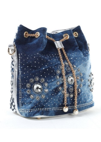 - Rhinestones. For all who love brilliance, rhinestones are a source of eternal inspiration.They are well combined with denim and will be relevant for all models of bags, the use of which is planned in the dark or with artificial lighting.