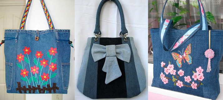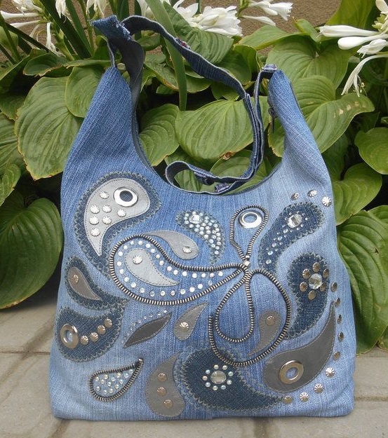 There are pure denim models of bags without any decorations, but in most cases they look too simple. Denim requires jewelry and goes well with them, and as a decor for the handbag, the following ideas are perfect: