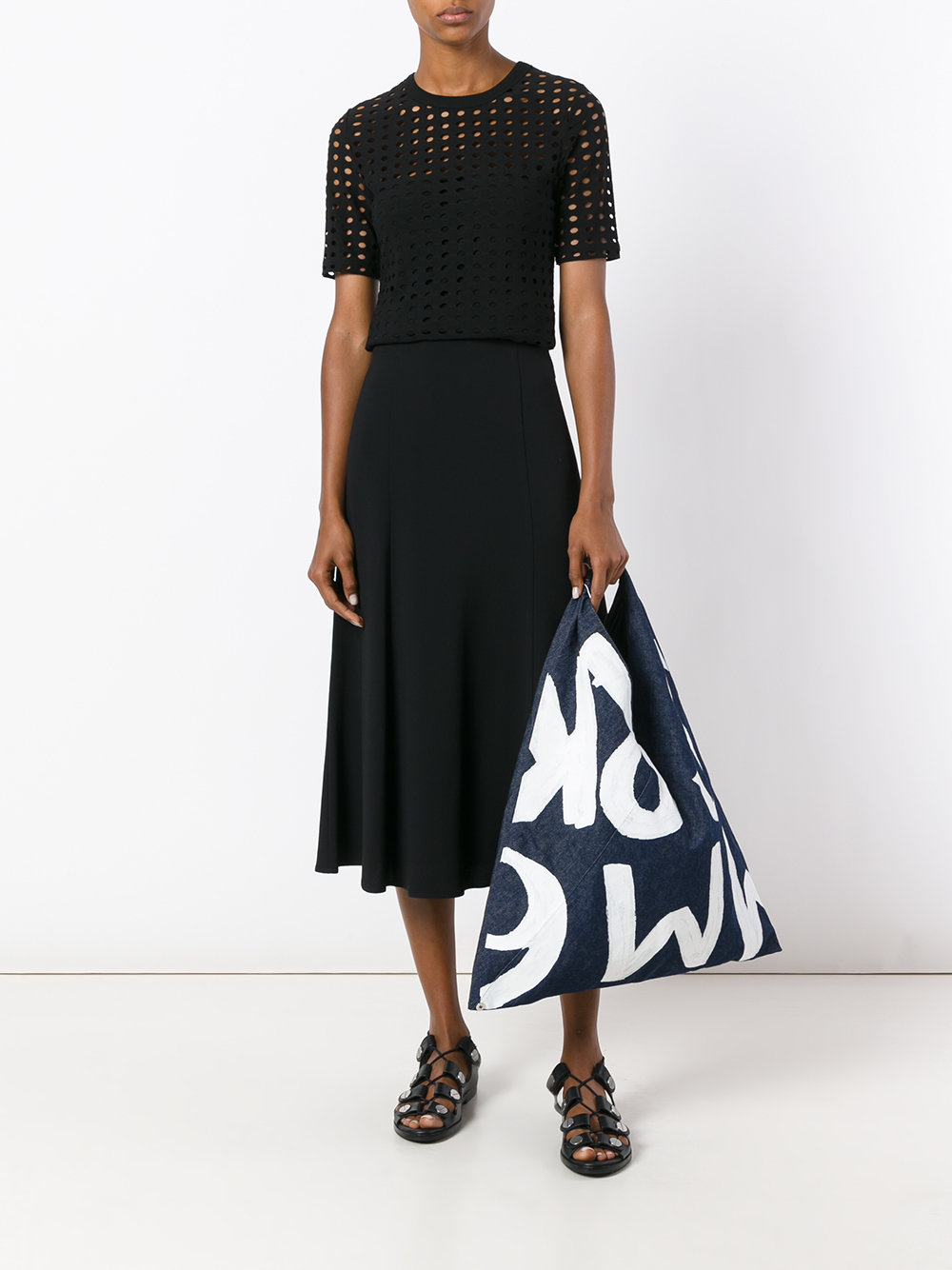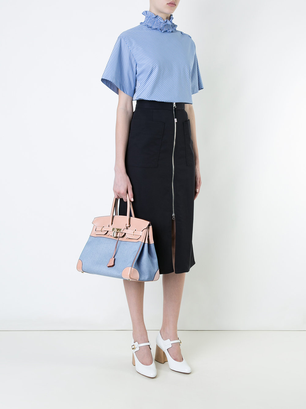 - Large geometric shapes or animal prints on clothes are usually not perceived as complete with a denim bag.