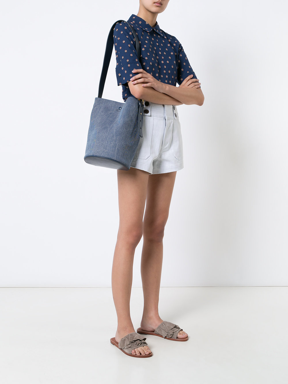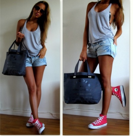 So, a beautiful image, at the same time very feminine and a bit predatory, is obtained by combining a dark blue denim bag with light blue denim shorts with slim tanned legs. Complement it with a monochromatic T-shirt and sneakers or sneakers - and all your men!