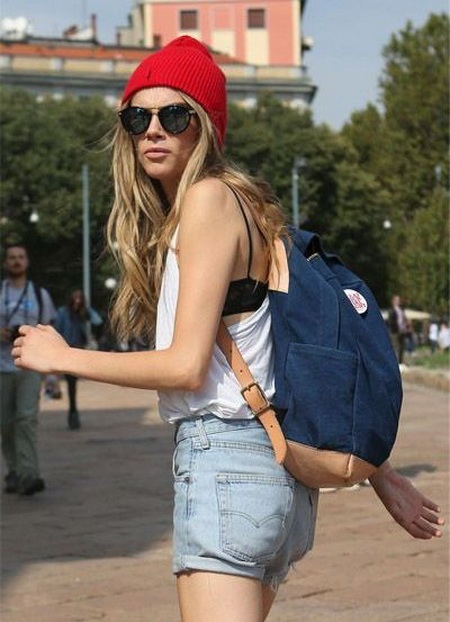 What is interesting, a similar selection of clothes, but with a denim backpack bag, will leave a completely different impression - the owner of the accessory will seem like a modern, active girl who loves travel and adventure, which also does not prevent her from being the object of increased male attention.