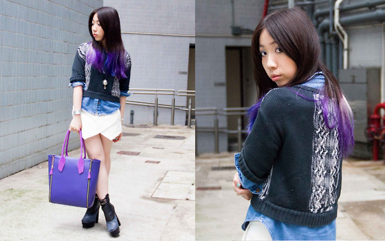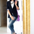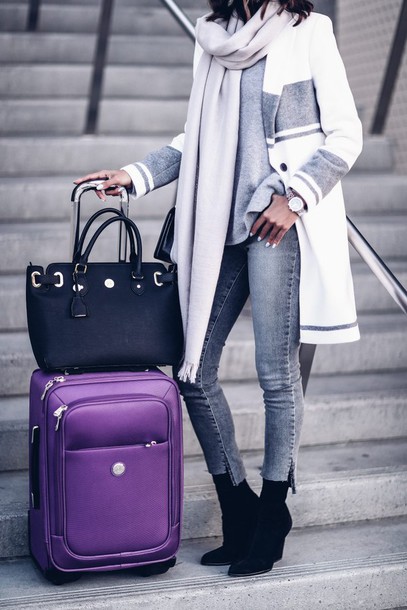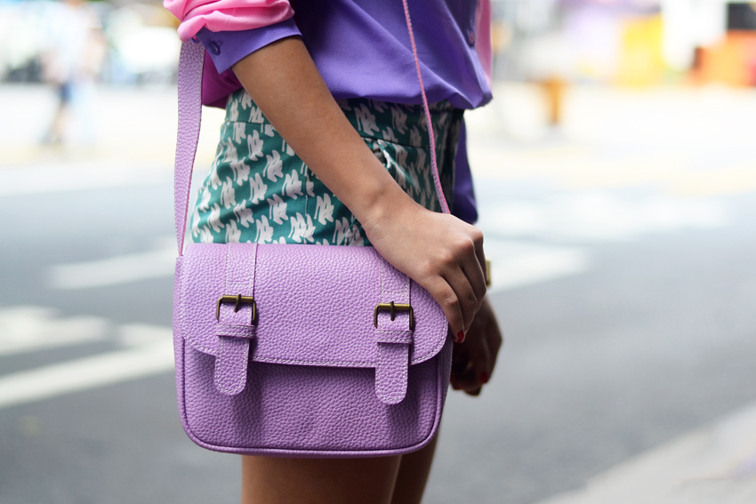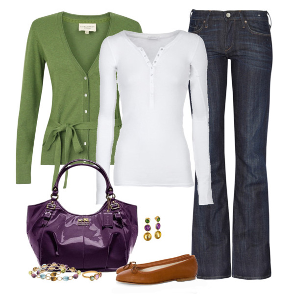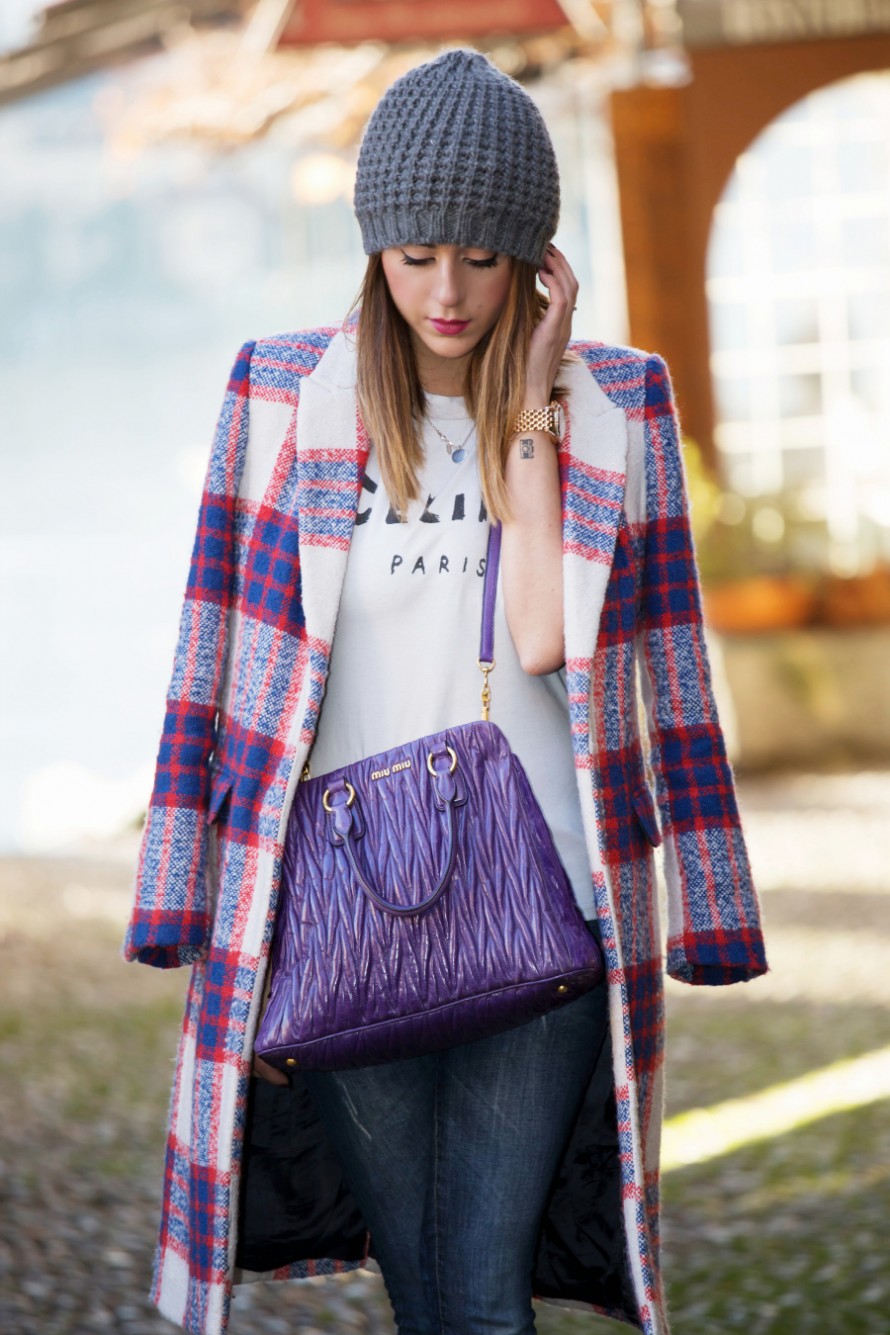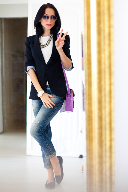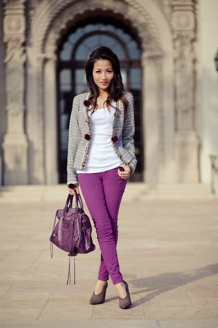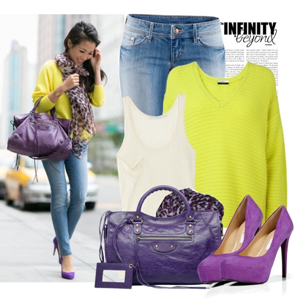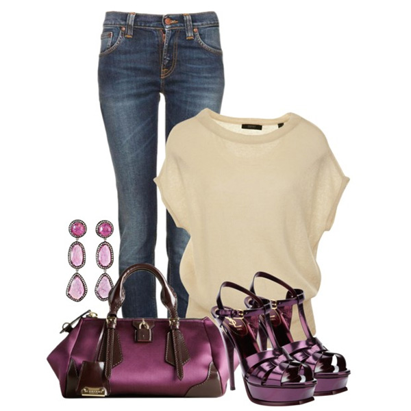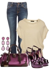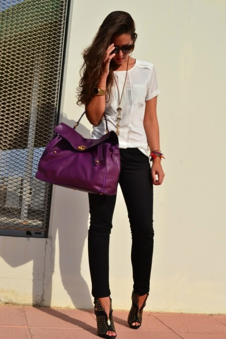 In a casual look, a purple bag goes great with blue jeans. Combine them with a shirt, t-shirt, shirt or blouse. Color harmonizes well with fitted trousers of dark shades and light oversized shirt.